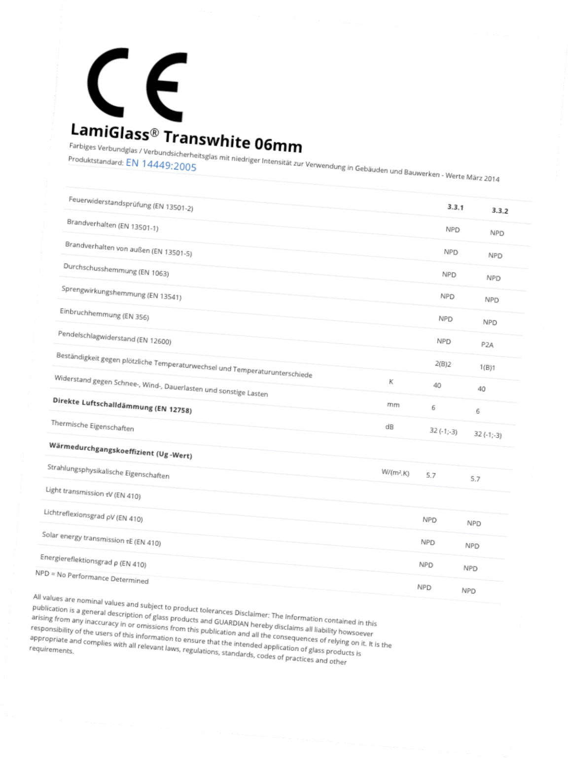 Unsere CE-Datenblätter enthalten alle relevanten technischen Informationen und Leistungsmerkmale unserer VSG-Gläser. Sie dienen als Nachweis der Qualität, Sicherheit und Normkonformität gemäß den europäischen Richtlinien.